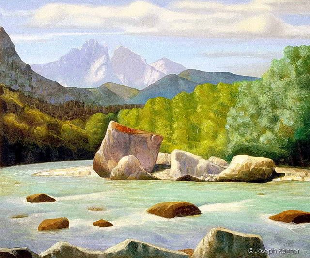 After laying off painting for ten years and producing over that time rather abstract work, this is my second painting in which I begin a representational phase. With no intention ever to exhibit (because in the avant-garde world it would be retro), I was free to paint as I liked. For that, I chose the valley near my hometown Eisenerz, not to forget my roots.