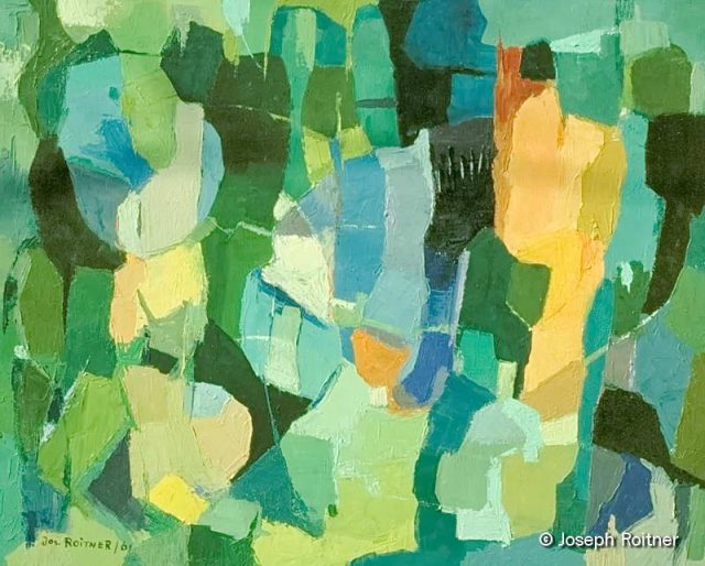 Since the colour green reminds us of all its different shades in nature, painters have almost found it NOT employable in semi-abstract expressions. It seems to lack depth and has symbolically little to say about relation to life. Unlike the primary colours. However, an old saying exclaims, hope is green and the romantic novelists hinted that green signifies the Devil. Aside of those implications, using primarily green for the abstract I took as a challenge to execute several paintings with the attempt to give GREEN a painterly dimension.