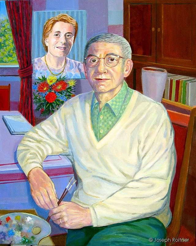 To some extent an old style Self-portrait with pallet + brush, yet with a living room setting and a window facing the garden. A strange choice was to have my wife behind me in a picture on the wall, as if it was someone not anymore around. Indeed, like a premonition, a year later she had left us forever but is in spirit still with us.
