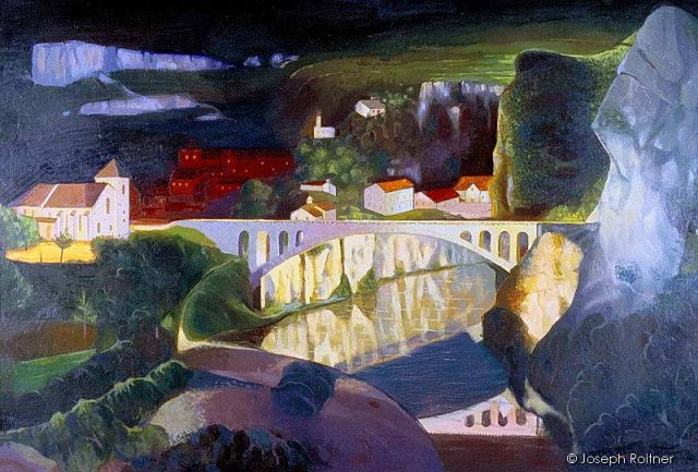 Remembering in France the little town after the river, over a bridge in darkness but artificial light in a romantic Setting.
