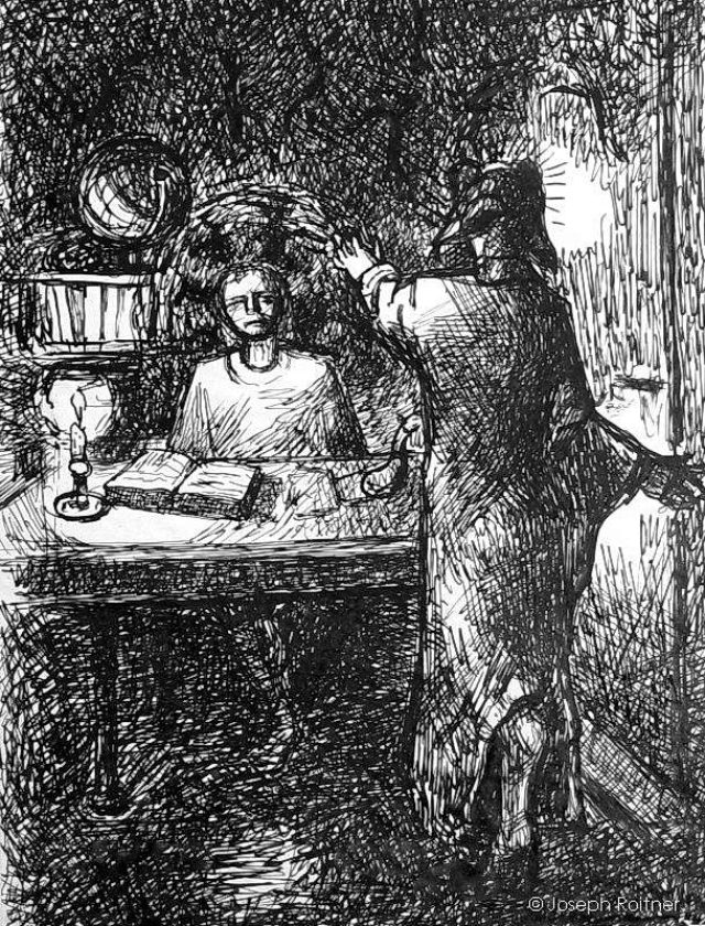 Dramatic scene when, according to the Fable, Mephisto appears in the Studio of Dr. Faust to make his proposition. He will fulfill all his earthly wishes if Dr. Faust agrees to sign a document with his own blood, stating to hand over his soul to Mephisto.