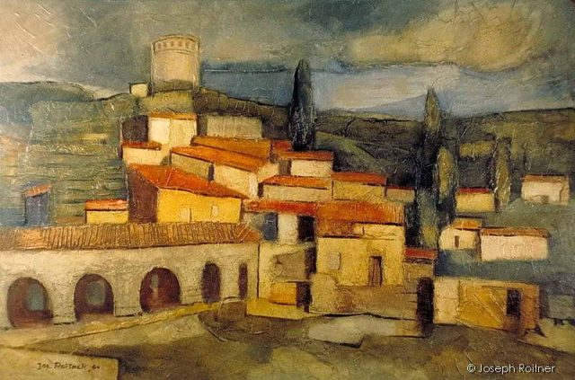 Town of St. Andre de Cubzac, France, seen as it was in the 19th Century. Hometown of my late wife, Jeanine. The background with its vineyards and water tower is still the same.