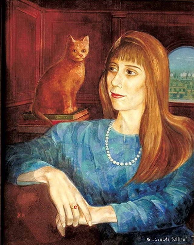 At the time I worked on this portrait, Susan cherished classic architecture and culture. Therefore, I thought it appropriate to place her as in a previous period, when one posed in a castle’s chamber, surrounded by books, and a mysterious, independent cat. Through the window is a formal garden that enriches a Chateau.