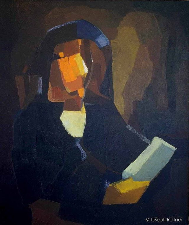 In the original, Rembrandt painted his son, reading. In my version however, I was trying to capture the essence of what made this painter so different from other painters. My tribute to Rembrandt is not meant as a copy of the original with his skill in technique or observation but, although in an semi-abstract manner, to emphasize the mystery and depth he was able to create around his images.