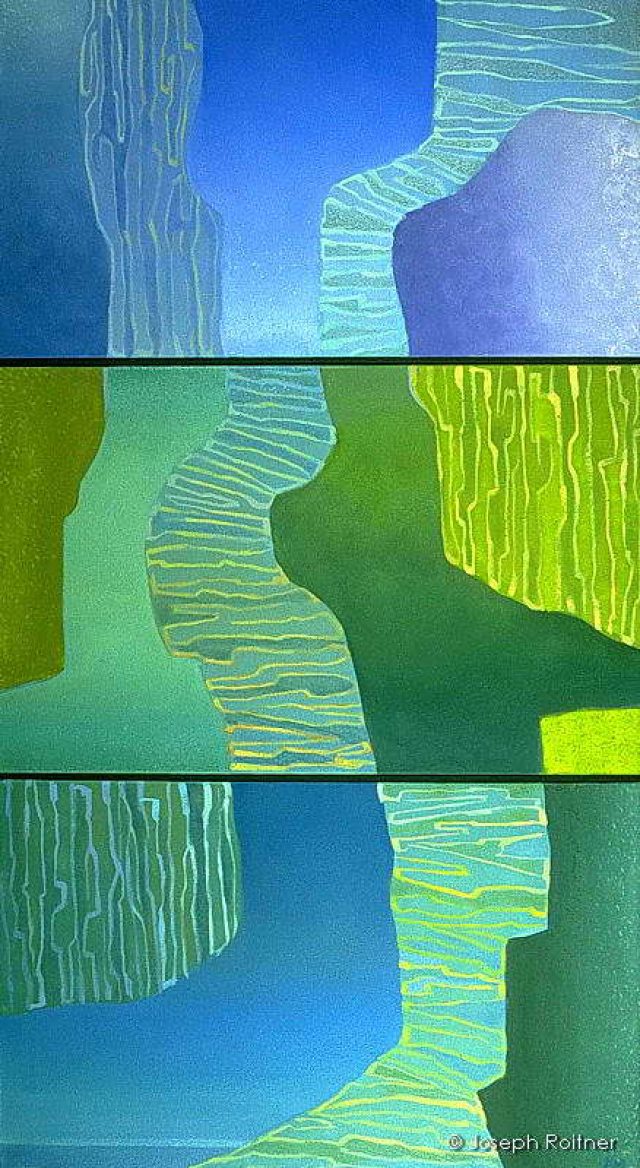 Unusual flow, shown in three panels, that begins in the sky, flows through a landscape and ends in a sea.