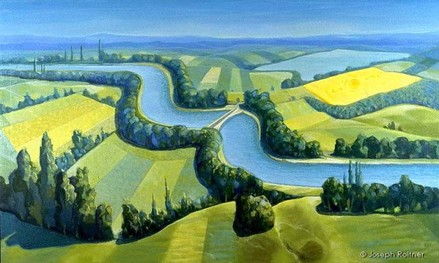This is an imaginary summer time landscape in the countryside with farming, no village, no town in sight. In the right cornfield there the once mysterious circles visible.