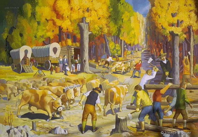 This painting was commissioned in 1970 by the German Historical Society, showing German farming Immigrants building for Governor Simcoe Toronto’s Yonge Street to commemorate the 200th anniversary.